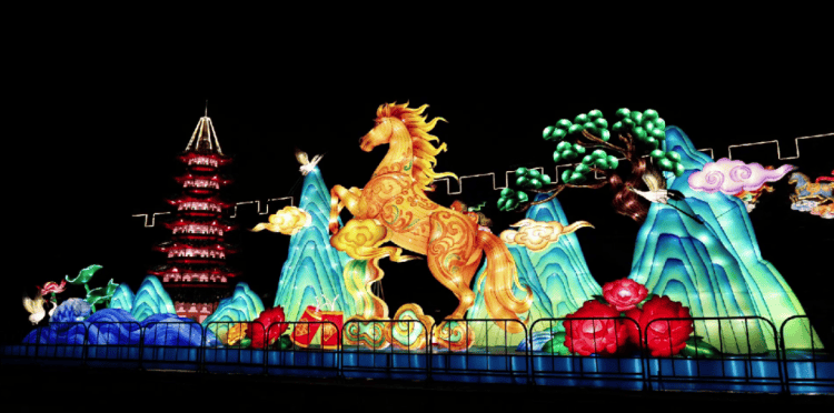江阴飞马千灯会以“梦回大唐”为主题,呈现赛博飞马、神骏天宫等五大灯组场景。央视春晚原址清名桥广场,古运河灯光与江南曲韵相得益彰。梅里古镇以“循光入境”为主线,在南北两岸串联起11处光影景点,其中最出彩的当属“春风得意马”——设计师以“春风得意马蹄疾”为灵感,打造出神采飞扬的骏马灯,马身缀满灯珠,恰似“银鞍白马飒流星”。