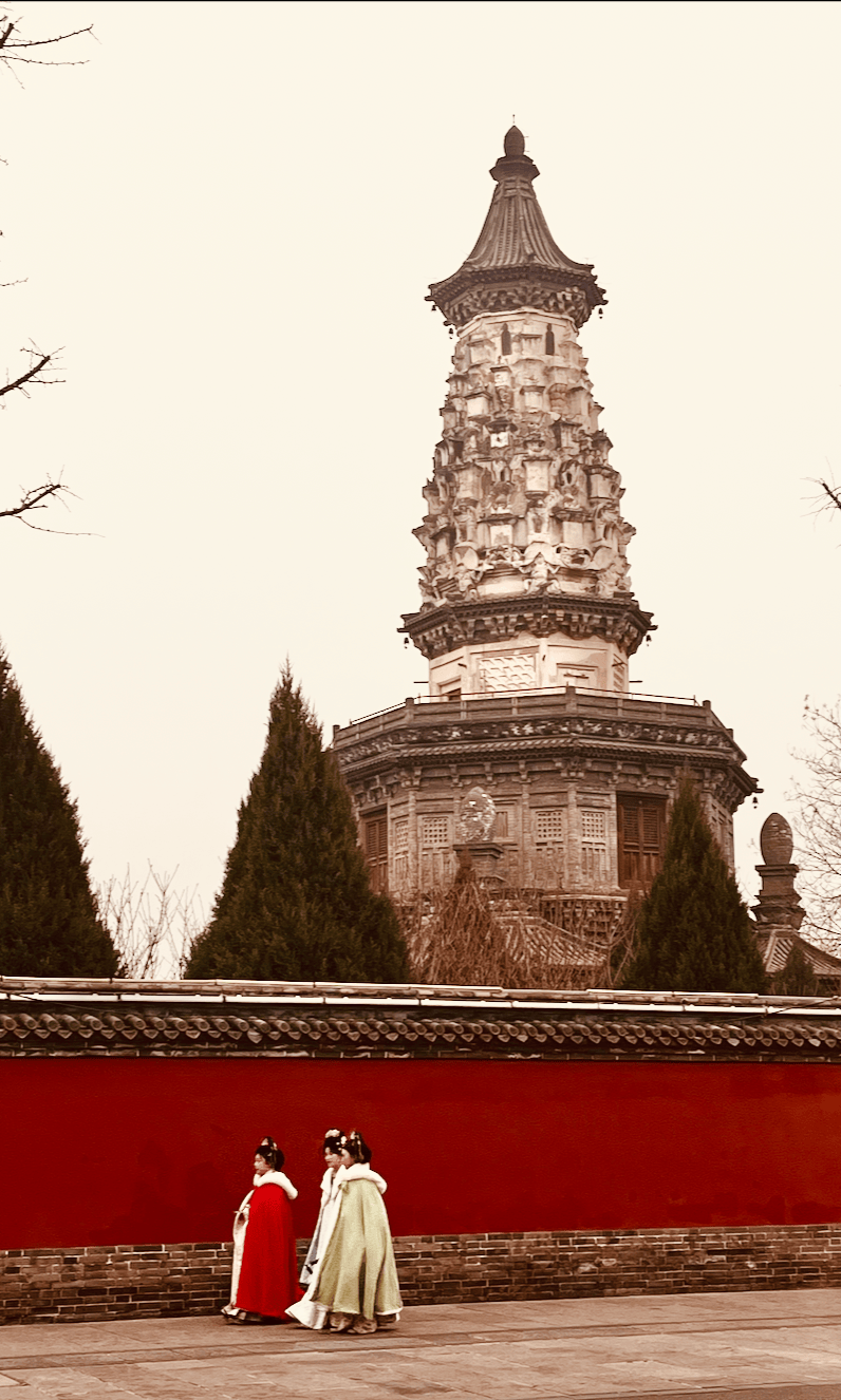 华塔周边分布着不少古风摄影影楼,随处可见身着传统汉服与仿古服饰的女子在此取景拍照,千年古塔与少女微笑交织。
