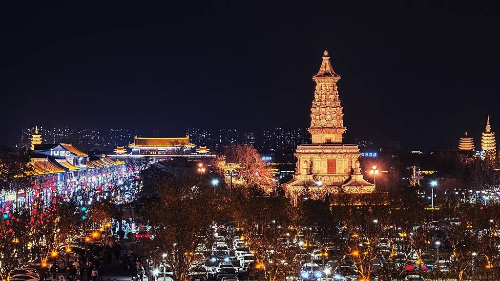河北石家庄正定古城 南门长乐门上看四塔同框夜景 视觉中国资料图