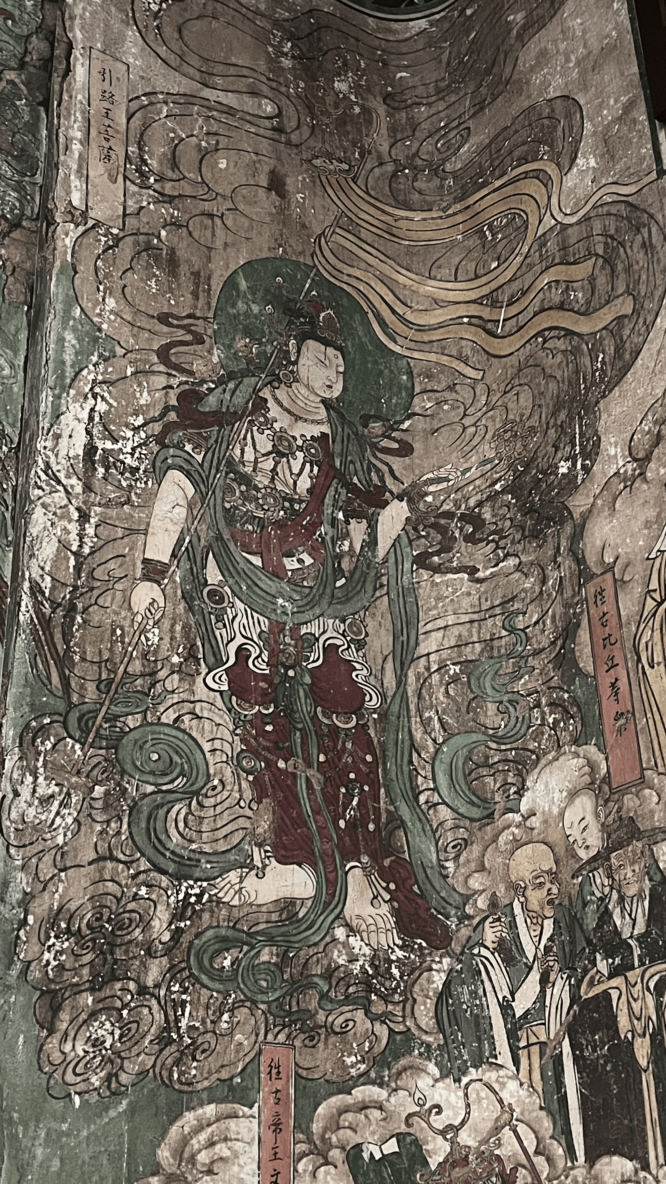 地处河北正定的隆兴寺始建于隋,兴盛于宋,是我国现存规模较大、保存完整的宋代佛教寺院,也是梁思成和林徽因曾经多次测绘调查的重要古建实例。寺内中心大殿大悲阁正在修葺。笔者来到摩尼殿观看悬塑观音像,两边的壁画因需要保护无法打灯,大都漫漶不清,难以看清细节。