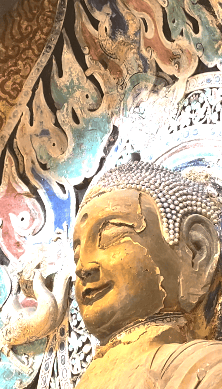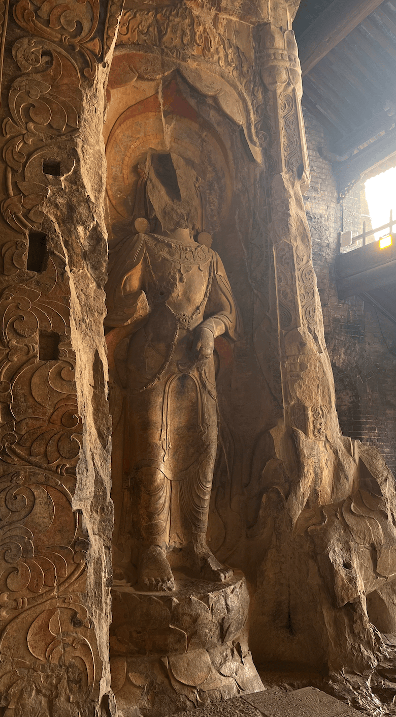行走在响堂山石窟,最直观、也最令人心痛的感受紧随其后:放眼望去,石窟里几乎所有的佛像都没有佛头,有一些颜色与材质与身像有所不同,都是后人补做的,壁龛中精巧的胁侍菩萨、飞天、供养人像,绝大多数头像也都被粗暴凿去,只留下一个个空洞而沉默的痕迹。残躯伫立,佛首无踪,整座石窟仿佛在无声诉说着劫难。