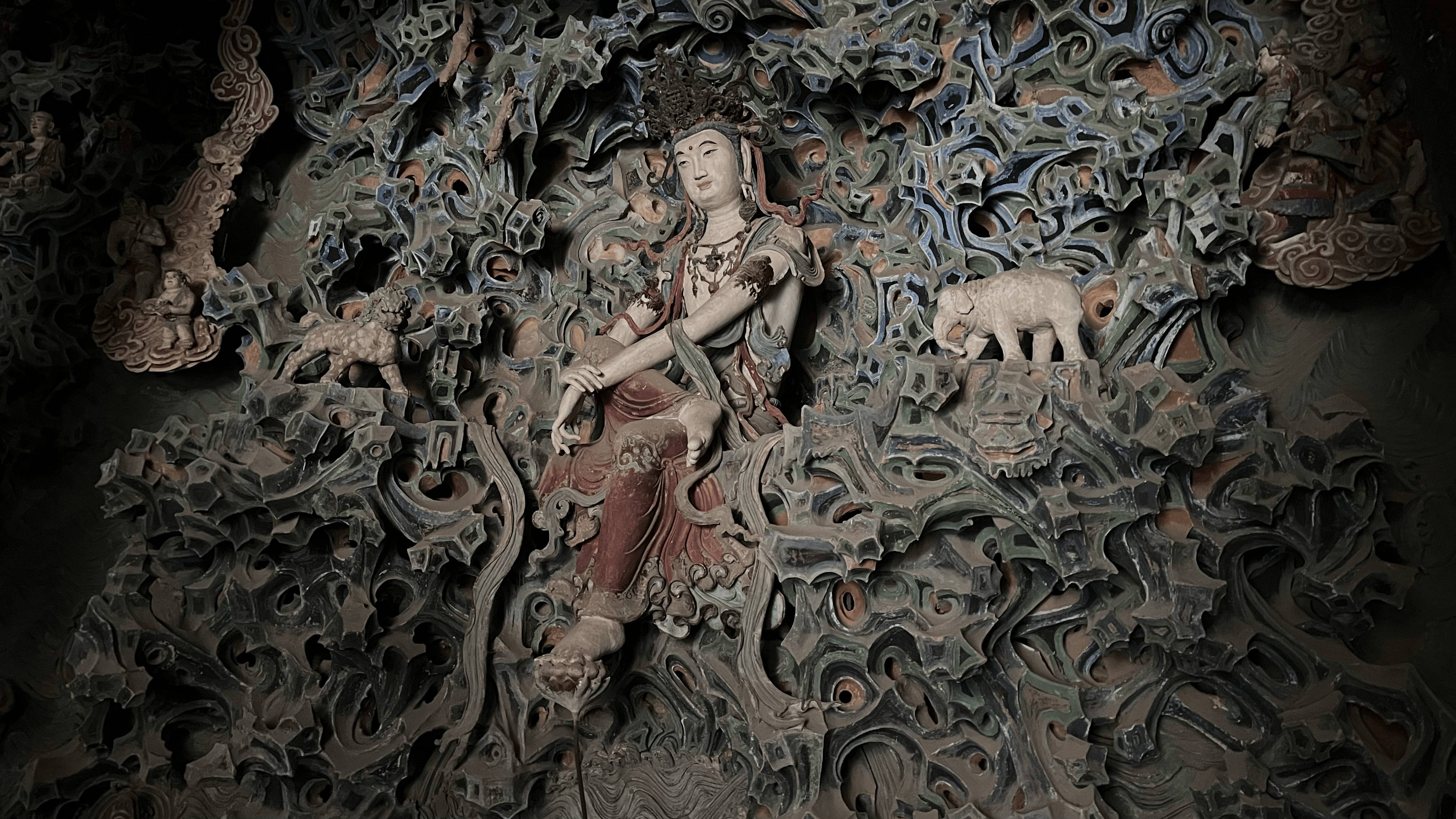 摩尼殿建于北宋皇祐四年(1052年),殿身四面出厦,形成十字抱厦的形制,梁思成认为此类布局在古代建筑实例中较为少见。殿内北壁的五彩悬塑倒坐观音,是整座寺院的精华之一。这尊观音一改宗教造像的庄严肃穆,右腿踞起、左足踏莲,身姿闲适自在,面容温婉含笑,目光低垂含情,曾被鲁迅赞为“东方美神”。这也是此行笔者寻觅佛像微笑的重要一站。民间有“问菩萨为何倒坐,叹众生不肯回头”的说法。