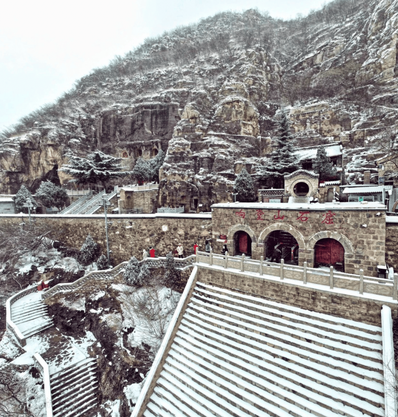 离开响堂山石窟的第二天,邯郸降下一层薄薄的雪。白雪轻轻覆盖在鼓山之上,将石窟、崖壁都裹进一片素白之中,千年沧桑,仿佛在这一刻被温柔抚平,只留下天地寂静,山河无言。