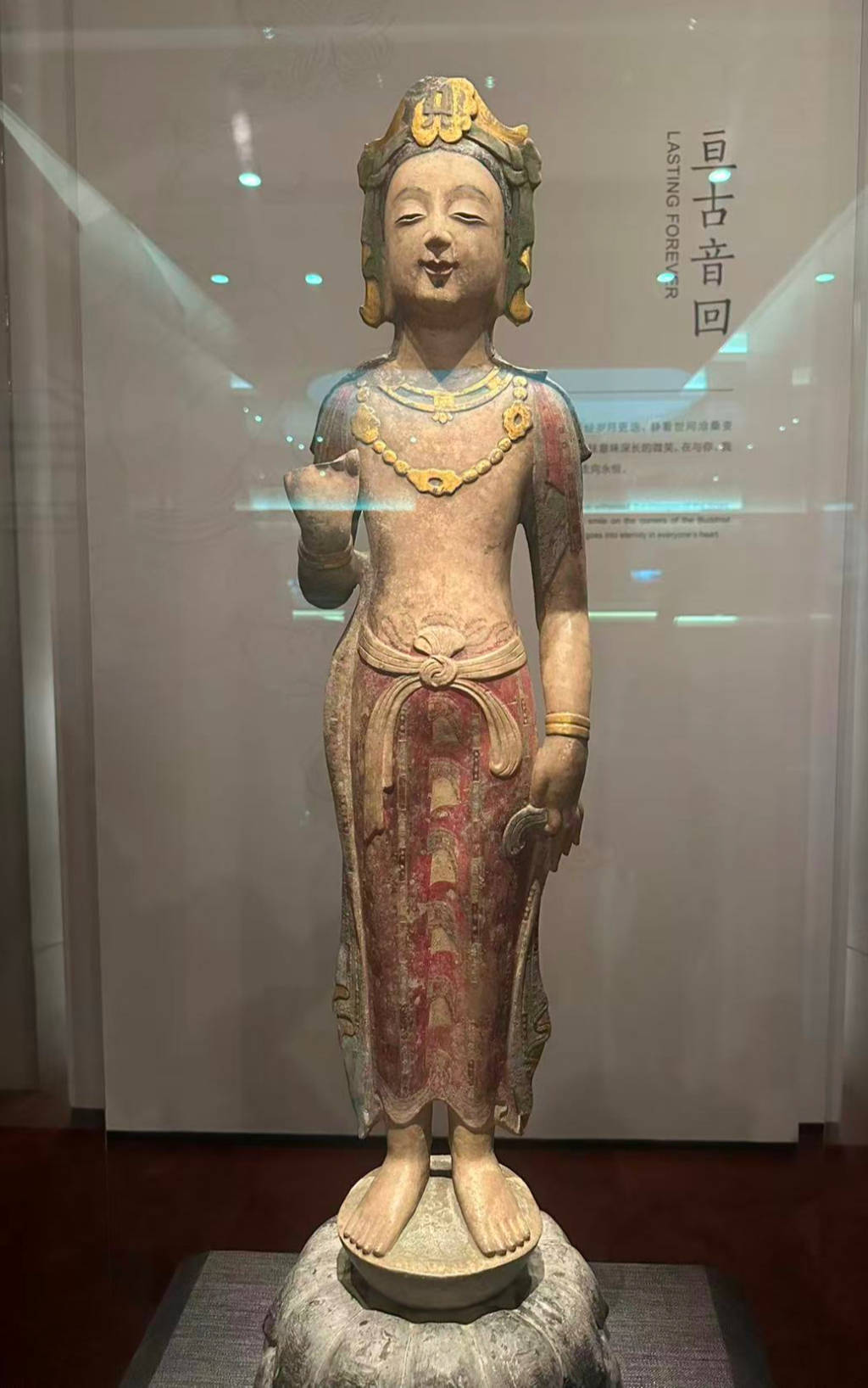 这尊菩萨立像体态修长匀称,面相圆润含笑,头戴贴金宝冠,宝缯下垂至肩,颈佩贴金项饰,身着红、蓝、绿三色彩绘百褶长裙,腰间束带打结,长裙曳地,跣足立于莲台之上。双臂残缺仍显典雅风韵,在一些论述中被称为“东方维纳斯”。