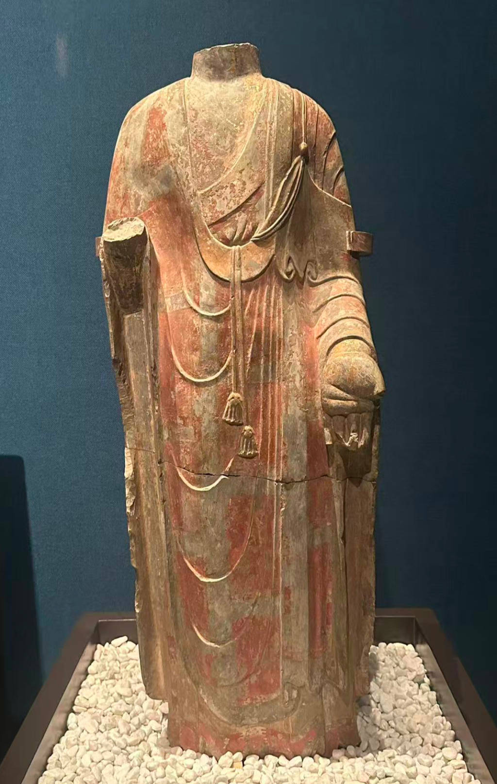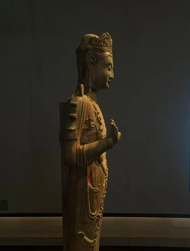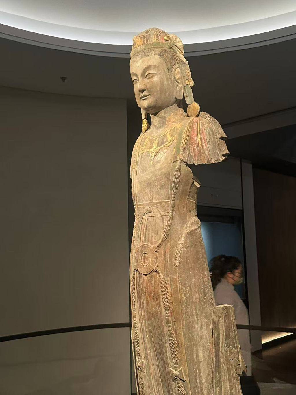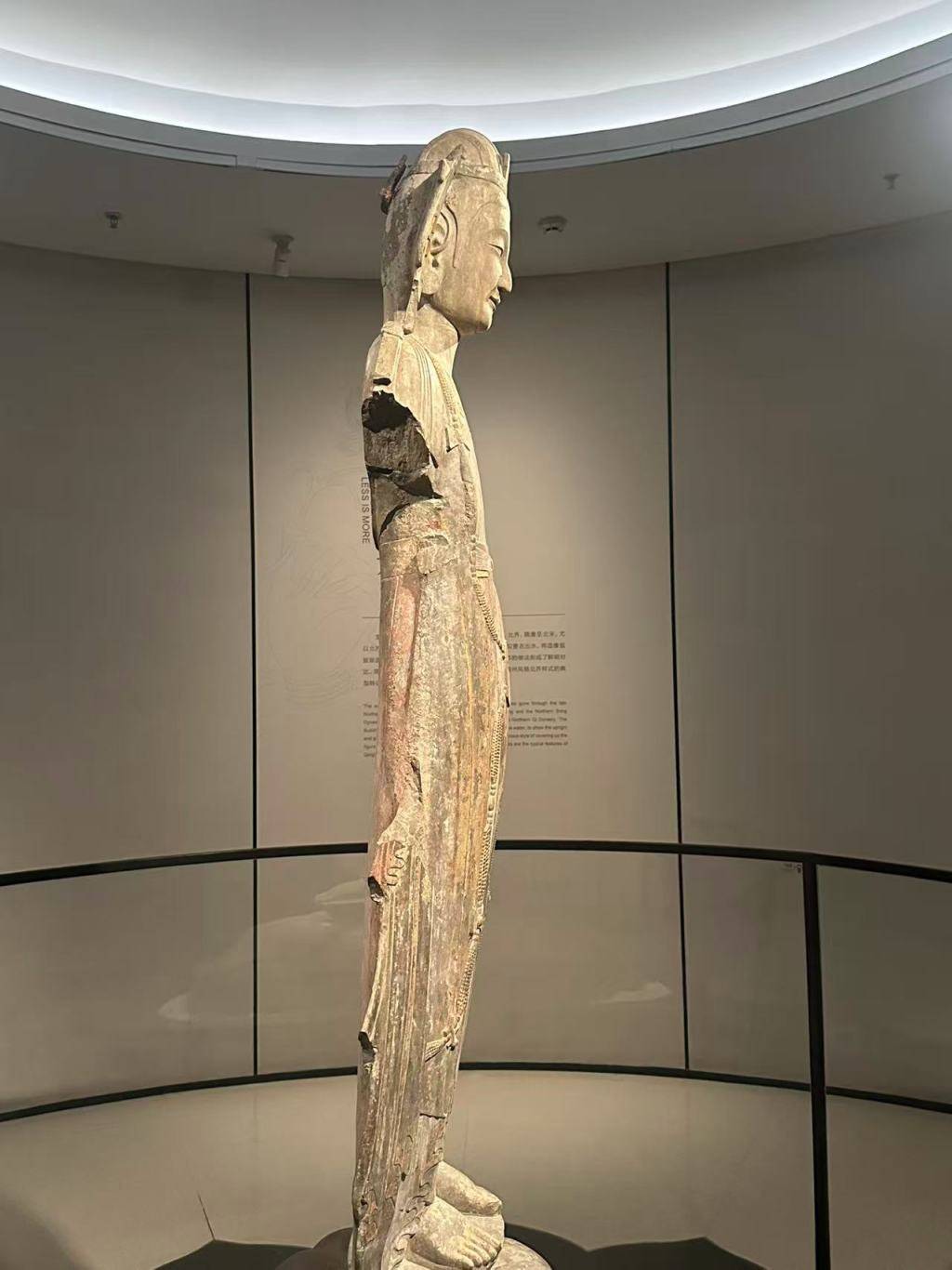 更重要的是,单体圆雕比例逐渐增加。佛像开始从背屏结构中“走出”,空间感增强,身体比例与姿态成为关注重点。在博物馆展厅中,一尊近两米的“东魏贴金彩绘石雕菩萨立像”,便呈现出这种新的趋势。