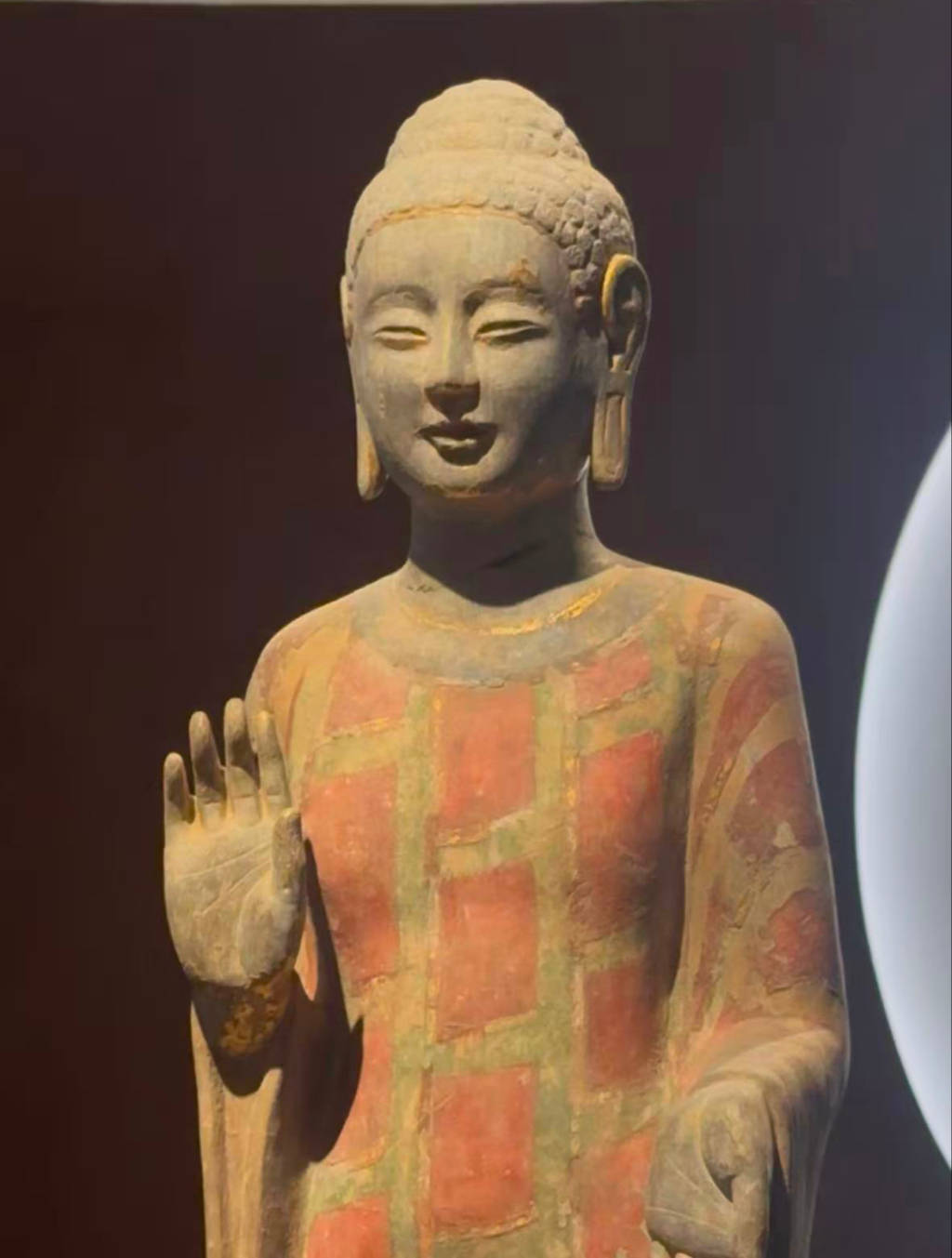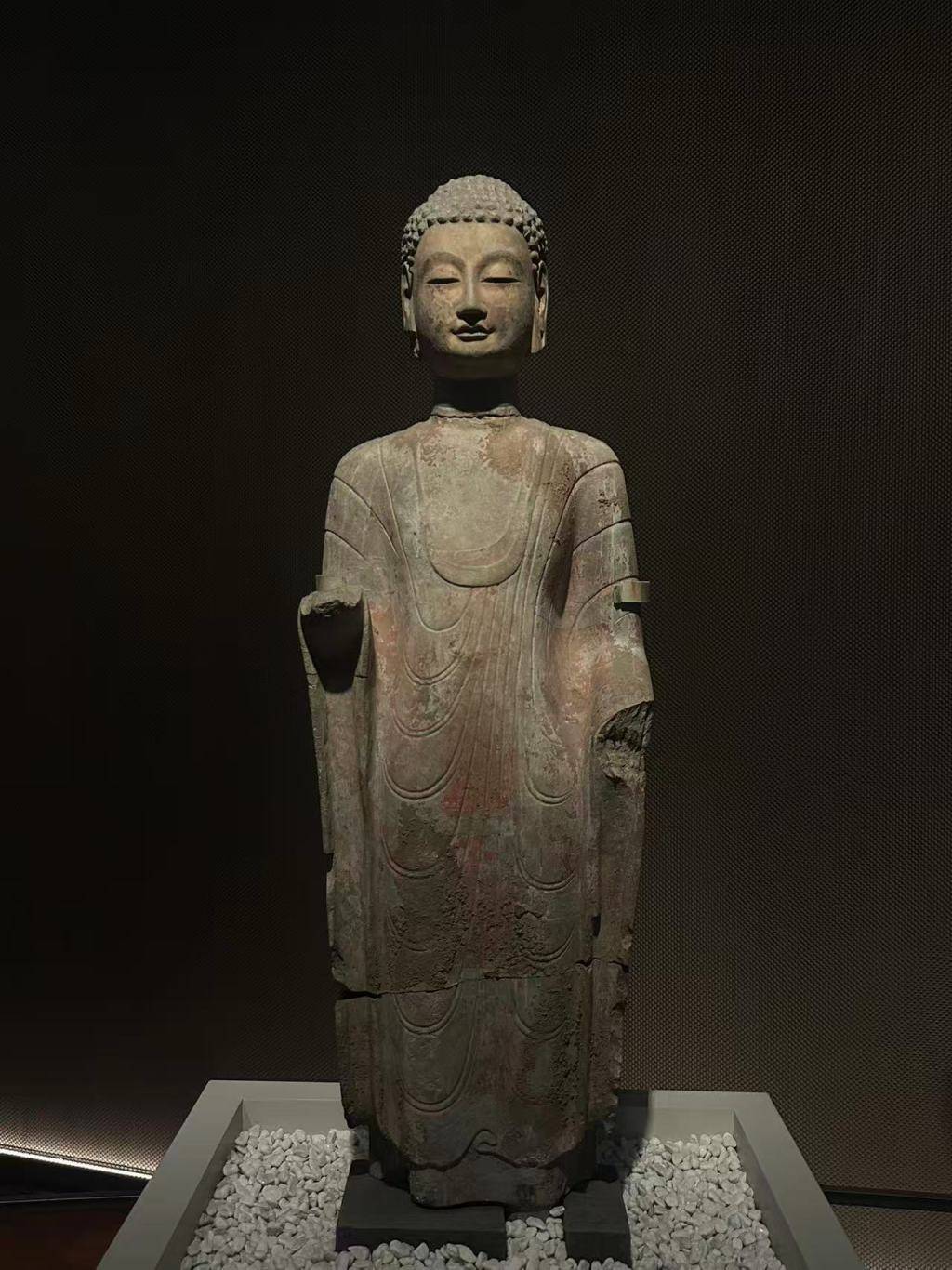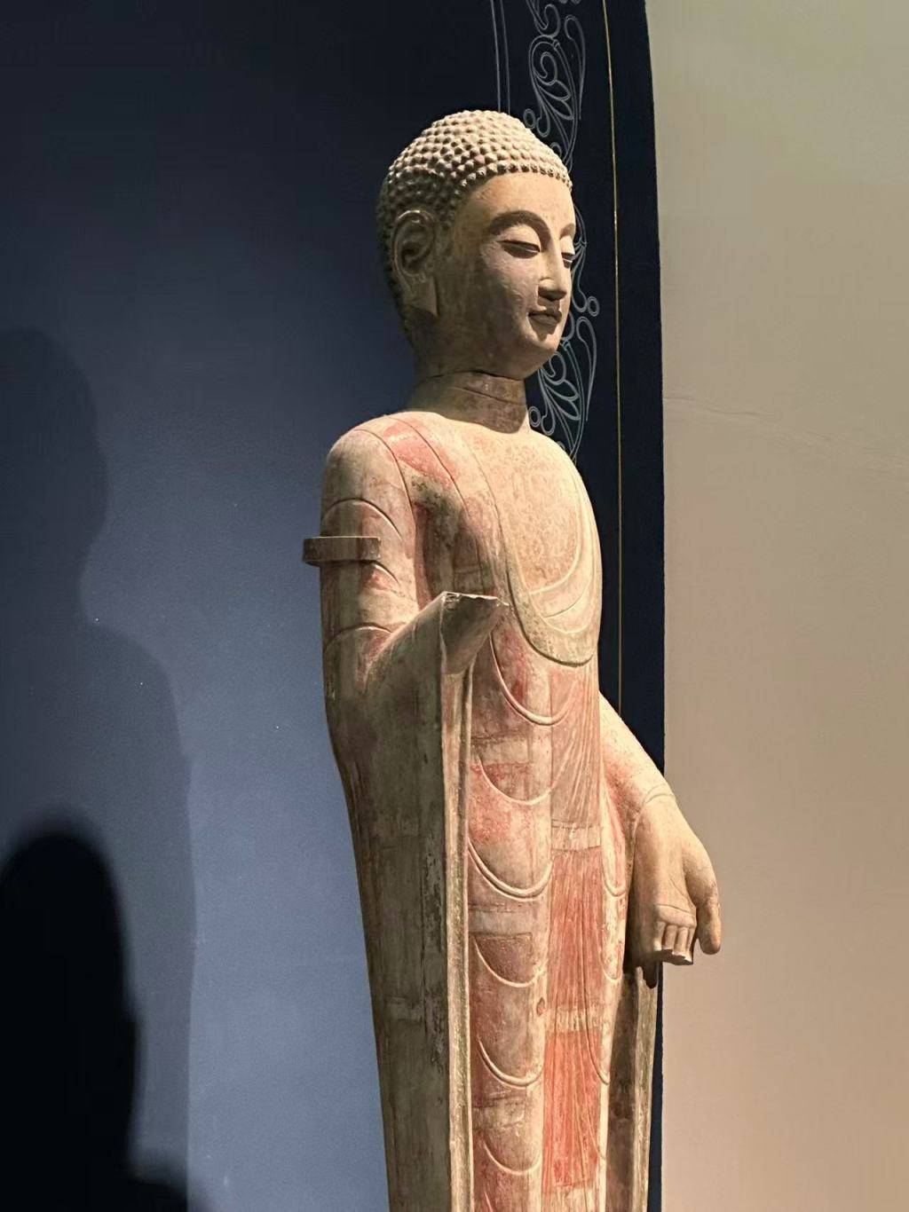 这尊北齐贴金彩绘圆雕佛立像展示的正是那种平静、温和、慈悲的“青州微笑”