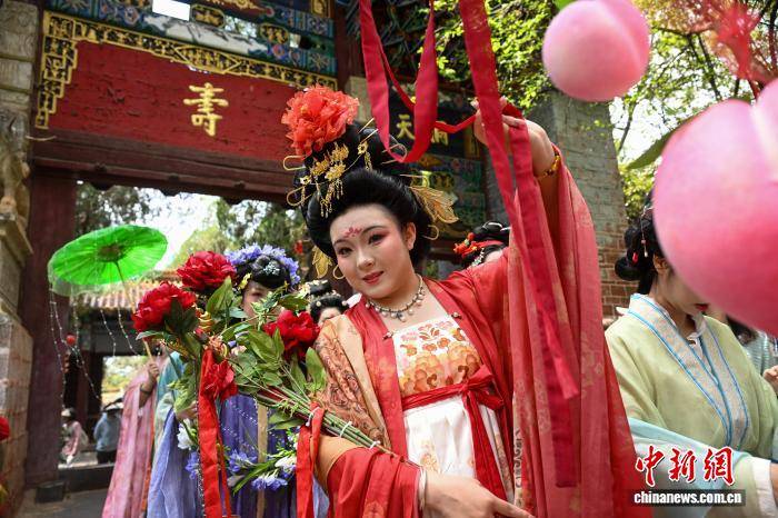 3月21日,云南昆明,汉服爱好者参与花朝节巡游活动。中新社记者 李嘉娴 摄
