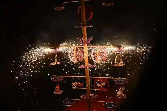 通过毛竹,土火yao,连同木偶机关,制作出动态的烟花效果。