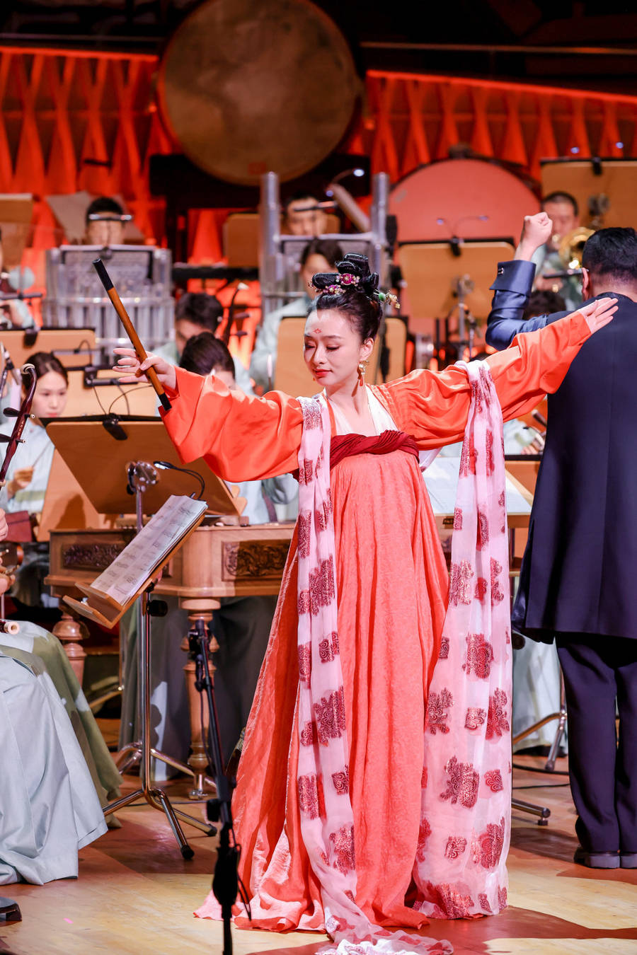六个音乐篇章以国乐为笔,以诗词为魂。《万物生息》从“天命玄鸟”的创世神话出发,追溯文明源头,唤醒人类对世界永不停息的好奇求索。《江河滔滔》中,从“昔我往矣”的柔肠到“大风起兮”的豪情,诉说先辈踏遍山河留下的英雄长歌。《朝日流霞》把“天生我材必有用”的自信与酣畅融进旋律,当演奏家赵韵梦身着一身唐装,不仅以笛声勾勒盛世气象,更亲身演绎唐代乐舞的绰约风姿,乐舞相合,呈现女子的自信与气韵,温婉中自有风骨。