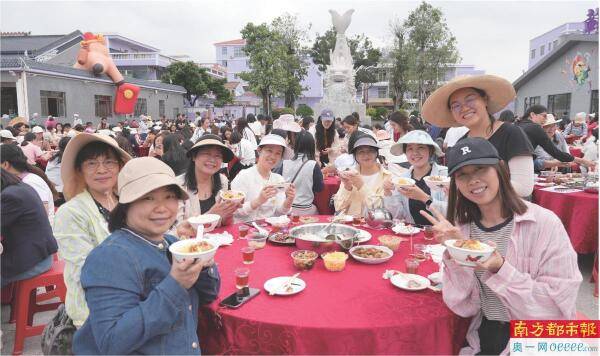 蘇村锦鲤文化街区300围宴席同时开动,濑粉热气升腾;阮埇村祠堂前千人共食,醒狮欢腾;长安社区禾洲村锦鲤放养,江湾社区上湾村龙舟划水……这一天,荷城25个村(社区)同步摆下濑粉宴,百村千桌万人,共赴这场非遗与乡情的盛宴。