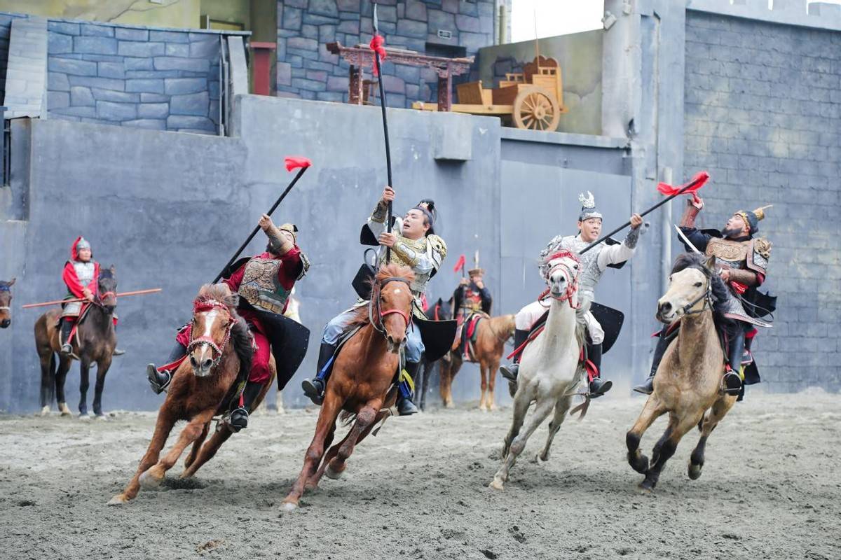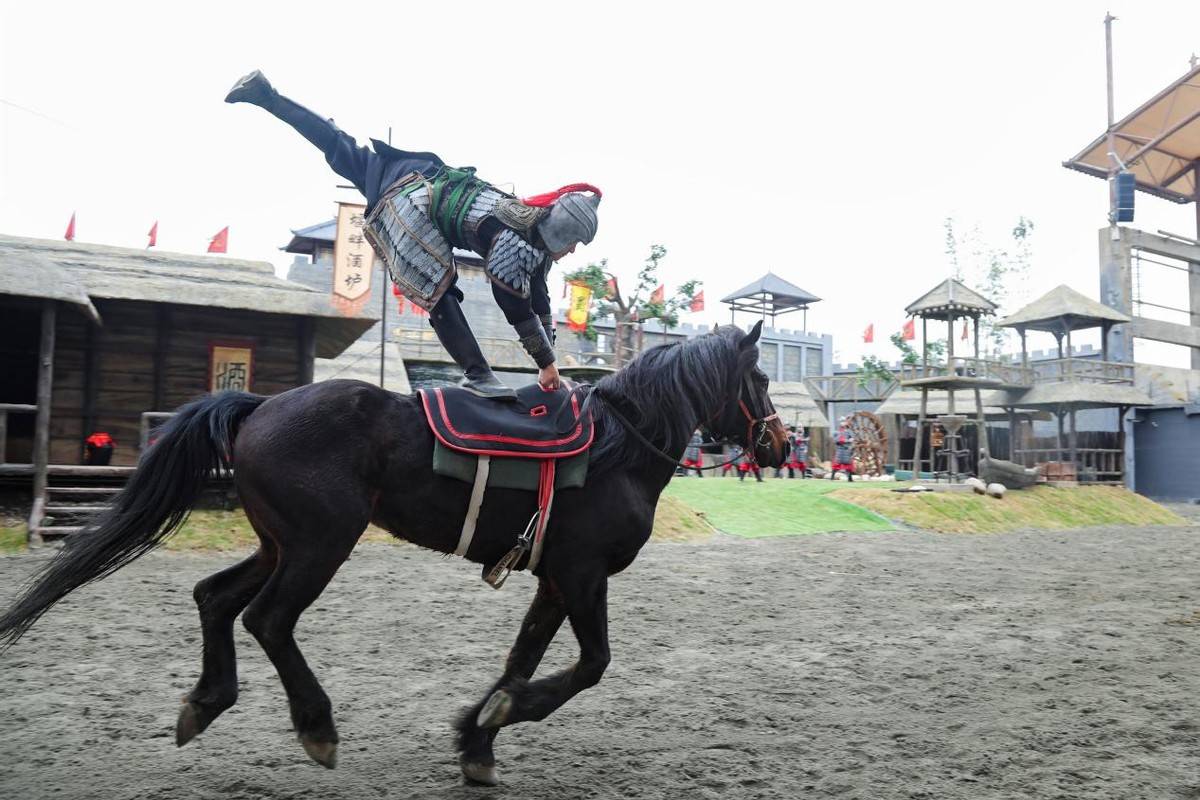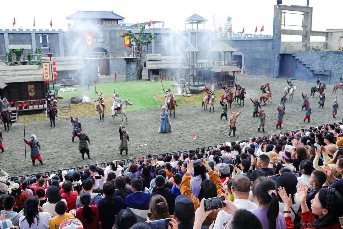 另一部实景主秀——四川首部大型马战特技实景秀《马超镇守都江堰》演绎巴蜀热血与豪情。在6000㎡真实沙场上,村庄、城楼、军营等场景高度还原,80余位专业演员携数十匹骏马,以马背站立、马上骑射等高难度马术特技,配合炮火、狼烟、水爆等史诗级特效,实现水陆空三栖联动,尽显蜀地英雄气概。
