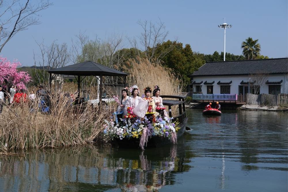 敲蚕花鼓、献三牲、诵祭文、上蚕香、行祭礼,蚕花“礼”民俗仪式,每一个环节都承载着蚕乡儿女对风调雨顺、蚕花茂盛的美好祈愿。民俗巡游展演环节,民俗队伍浩浩荡荡穿行于村道之间,蚕花仙子与十二花神乘花船翩然而至,沿途撒下寄托祝福的蚕花。