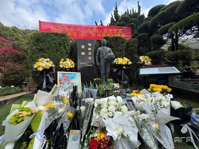 鲜花、战机模型、手写诗歌、自制明信片……4月1日,“海空卫士”王伟烈士牺牲25周年,杭州市安贤陵园的王伟烈士墓前再次聚满了前来缅怀与表达思念的人们。