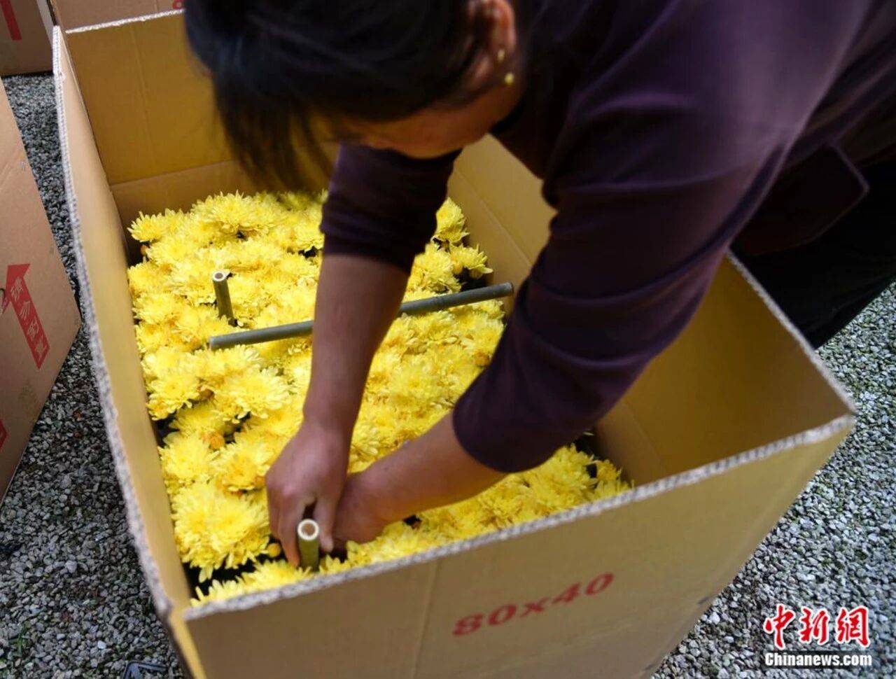 花农用竹枝支撑箱子,避免菊花被箱体挤压。张敬伟 摄