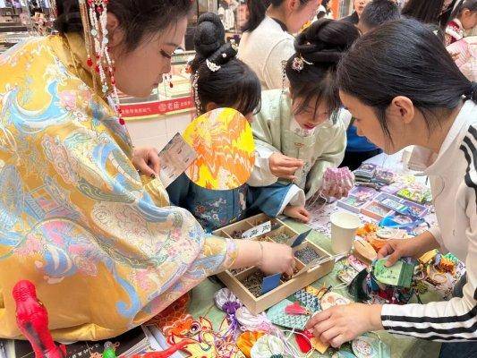 同时,现场设置的纸鸢DIY活动备受亲子家庭青睐,家长与孩子携手合作,绘画、扎制、亲手制作专属风筝,寄托对春日的美好期许,契合清明踏青放鸢的传统习俗,尽享亲子协作的温馨时光。此外,宋锦福卡打卡、市民摊位互动环节人气高涨,市民们穿梭于各个打卡点,集章打卡、互动交流,在轻松愉悦的氛围中感受传统文化的活力,收获满满的节日惊喜。
