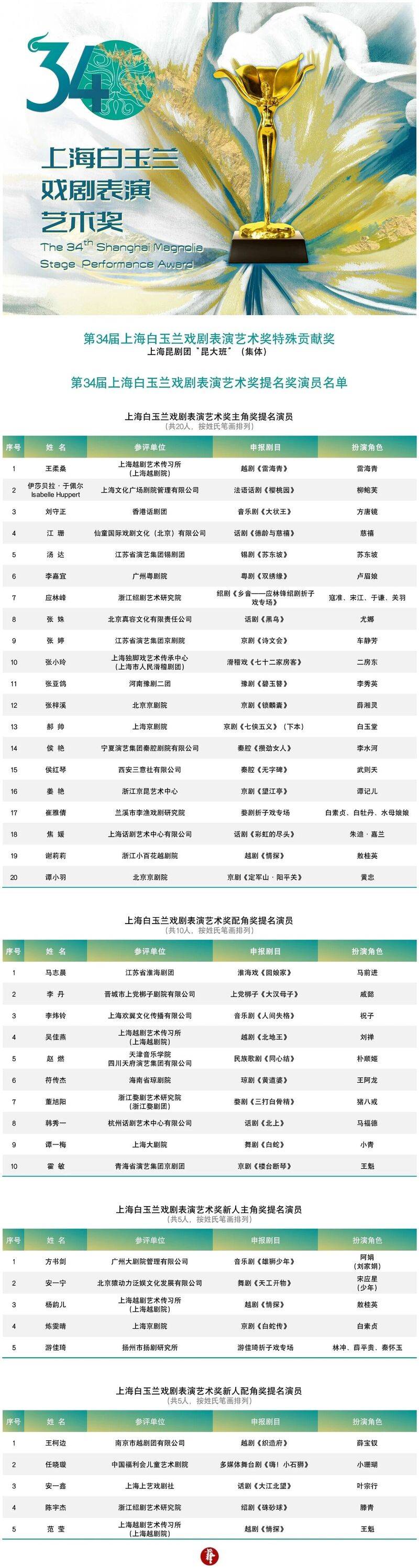新闻附件:第34届白玉兰戏剧奖提名名单