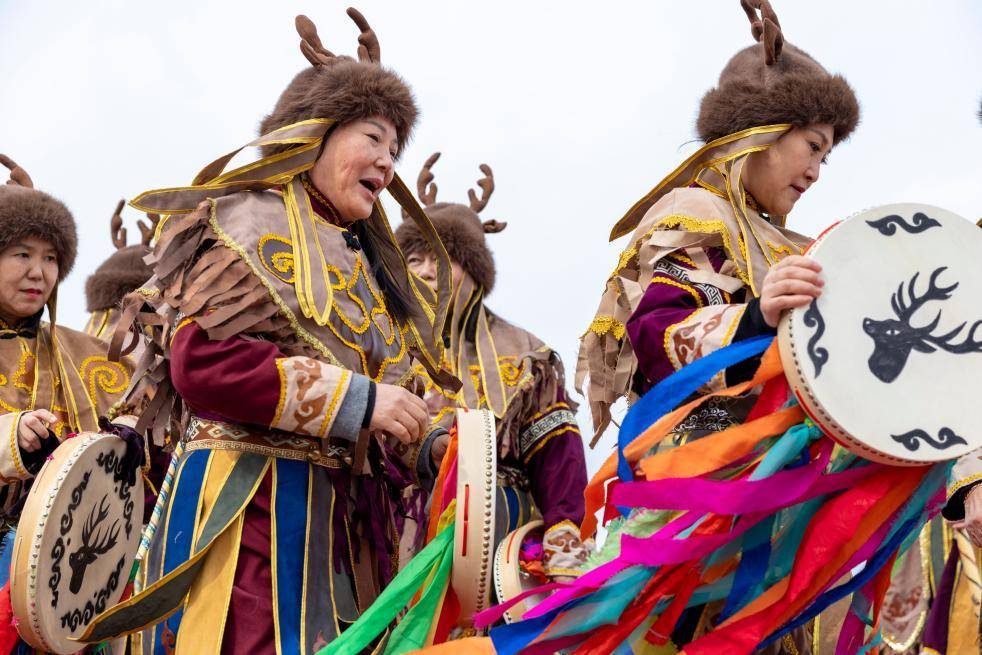 上午9时,开江祈福仪式如期上演,25位赫哲人身着传统服饰,踏着《温吉尼》的古老韵律,手持萨满鼓,用沉稳有力的鼓点,将渔猎文化的独特魅力展现得淋漓尽致。
