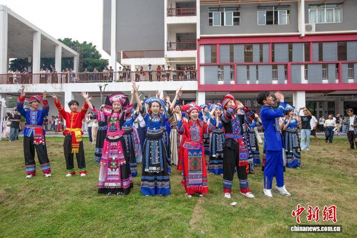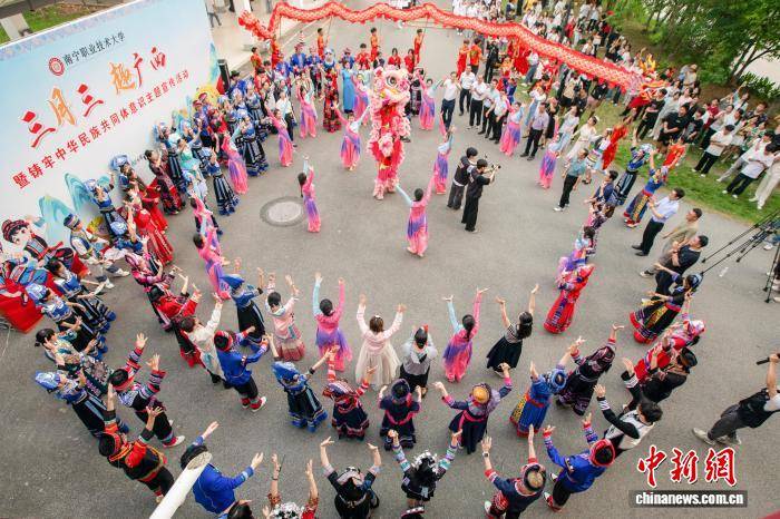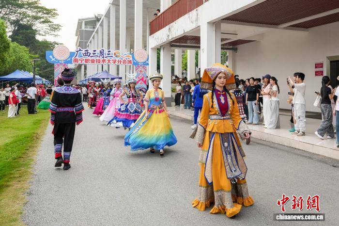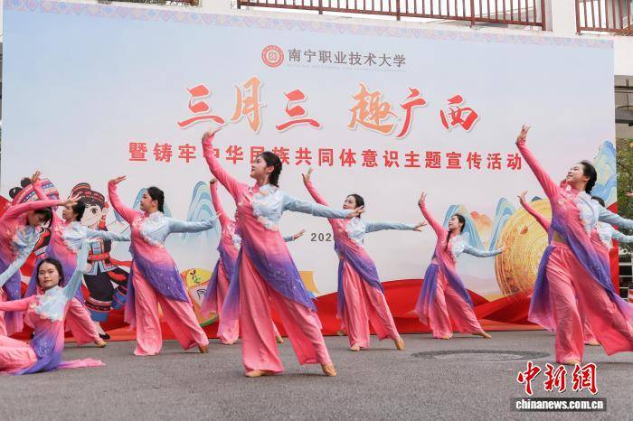 随着农历三月初三临近,广西处处洋溢着浓郁的“三月三”节日氛围。连日来,唱山歌、抛绣球、竹竿舞、抢花炮、板鞋竞速等独具特色的民族体育项目和民俗活动在广西各地轮番上演,吸引八方游客前来体验。图为南宁职业技术大学学生在表演民俗舞蹈。南宁职业技术大学 供图