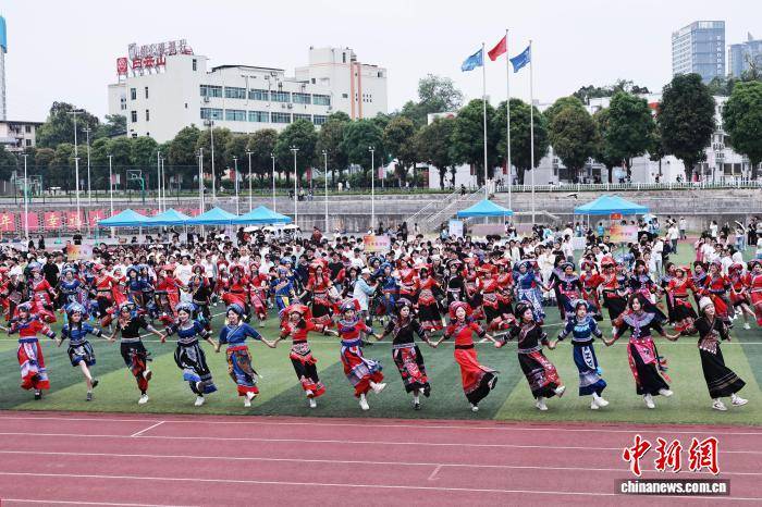 图为在广西三江侗族自治县古宜镇江川小学,学生齐跳多耶舞。龚普康 摄