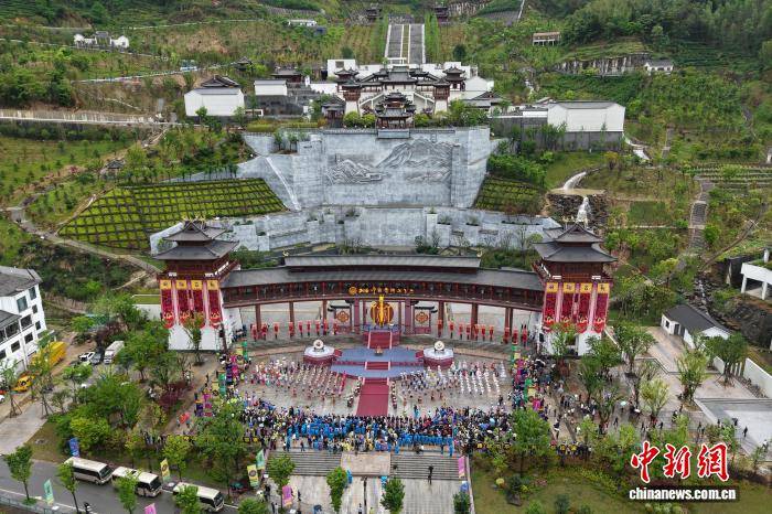 4月18日,中国畲乡“三月三”活动启动暨“公主巡游”民俗风情沉浸式展演在浙江省丽水市景宁畲族自治县举行,集中展现畲族民俗文化,让市民游客沉浸式感受畲乡的独特魅力。图为“同心纳福”仪典现场。(无人机照片)中新社记者 孙杨洋 摄