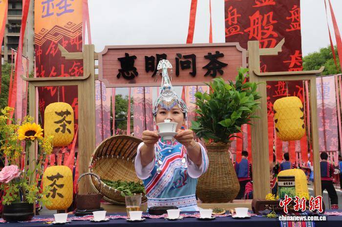4月18日,中国畲乡“三月三”活动启动暨“公主巡游”民俗风情沉浸式展演在浙江省丽水市景宁畲族自治县举行,集中展现畲族民俗文化,让市民游客沉浸式感受畲乡的独特魅力。图为表演者展示景宁惠明茶。中新社记者 傅飞扬 摄