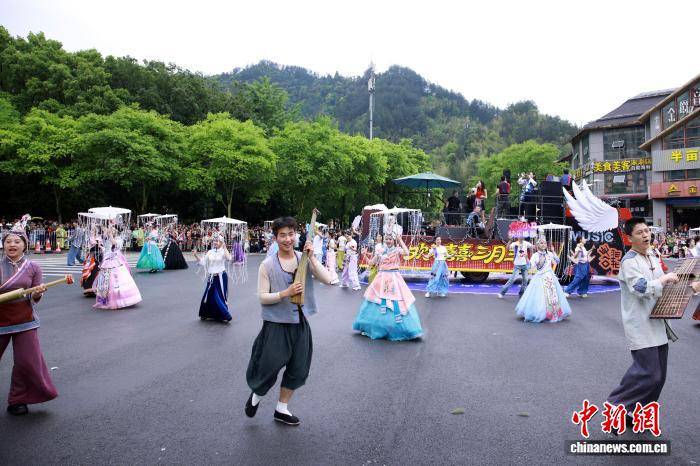 4月18日,中国畲乡“三月三”活动启动暨“公主巡游”民俗风情沉浸式展演在浙江省丽水市景宁畲族自治县举行,集中展现畲族民俗文化,让市民游客沉浸式感受畲乡的独特魅力。图为表演者载歌载舞。中新社记者 孙杨洋 摄
