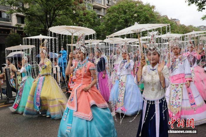 4月18日,中国畲乡“三月三”活动启动暨“公主巡游”民俗风情沉浸式展演在浙江省丽水市景宁畲族自治县举行,集中展现畲族民俗文化,让市民游客沉浸式感受畲乡的独特魅力。图为身着畲族服饰的姑娘在街上巡游。中新社记者 傅飞扬 摄