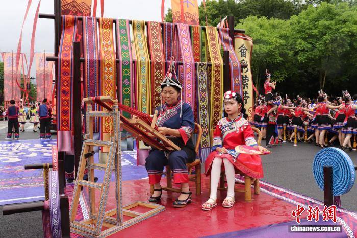 4月18日,中国畲乡“三月三”活动启动暨“公主巡游”民俗风情沉浸式展演在浙江省丽水市景宁畲族自治县举行,集中展现畲族民俗文化,让市民游客沉浸式感受畲乡的独特魅力。图为表演者编织畲族彩带。中新社记者 傅飞扬 摄