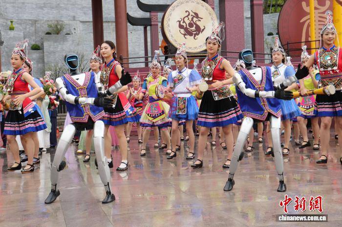 4月18日,中国畲乡“三月三”活动启动暨“公主巡游”民俗风情沉浸式展演在浙江省丽水市景宁畲族自治县举行,集中展现畲族民俗文化,让市民游客沉浸式感受畲乡的独特魅力。图为机器人与表演者一起跳畲族舞蹈。中新社记者 傅飞扬 摄
