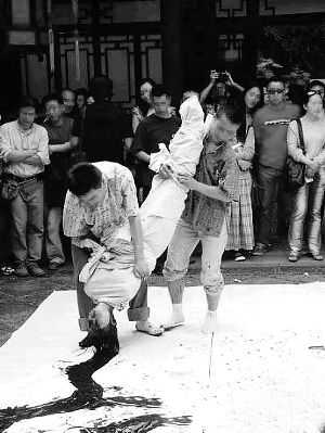 “江湖书法”披上民间卖艺杂耍的外衣,上演多管毛笔齐下,摆出各种奇特的姿势,铺开巨大的宣纸写,写几千米甚至上万米的长卷,申报吉尼斯纪录,显示非常人所能为,因而被视为“巨人”或“超人”。