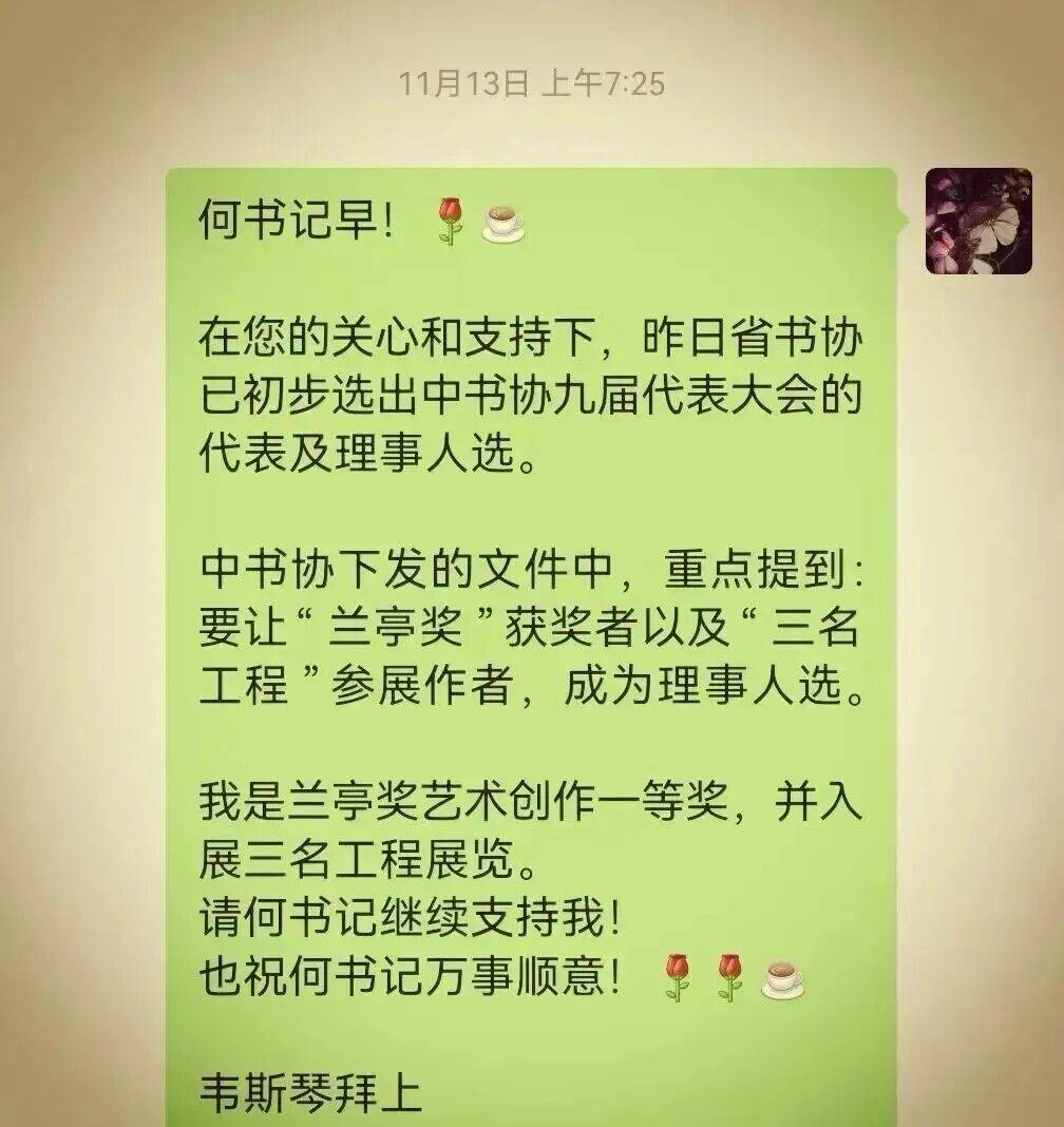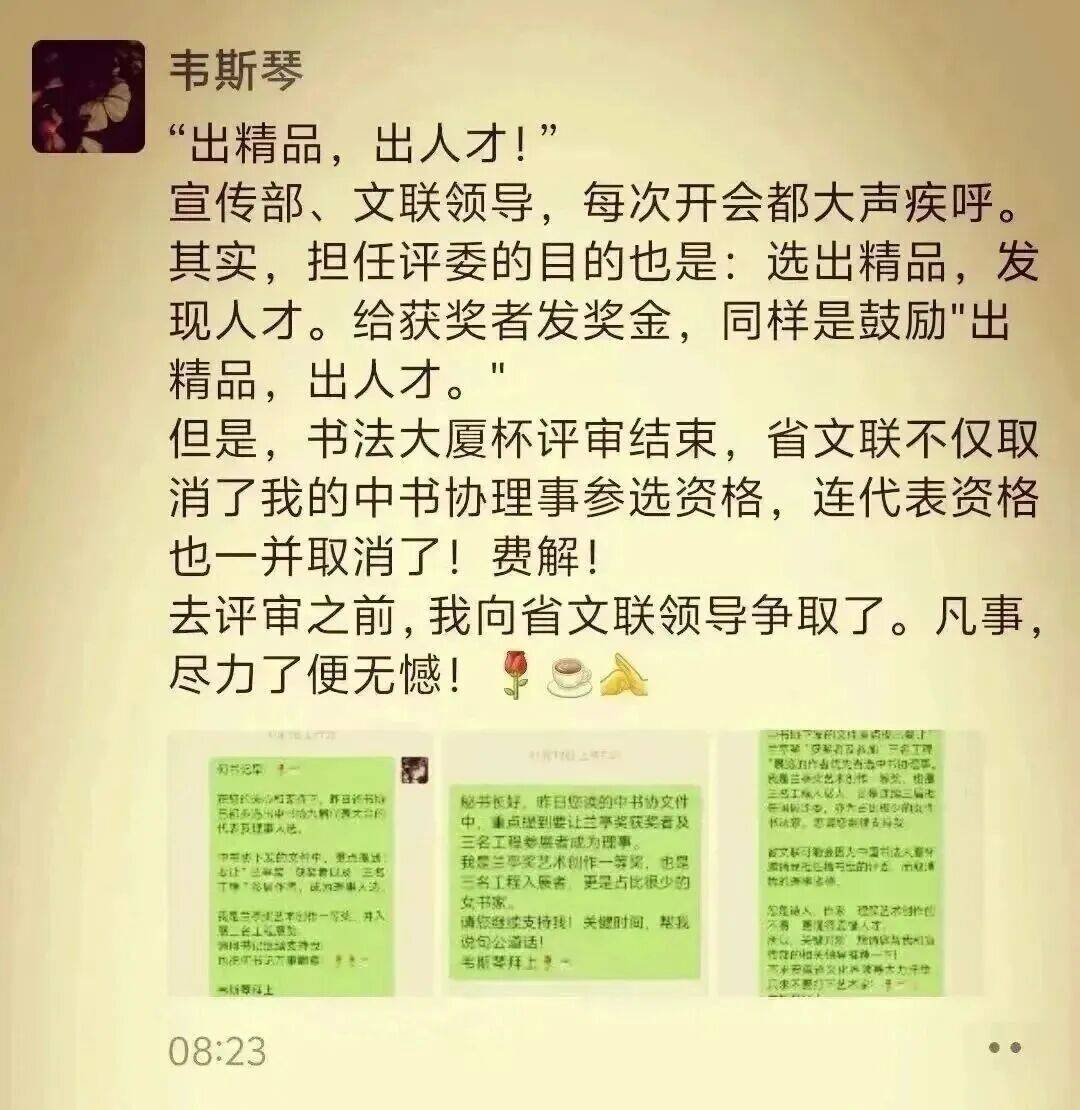 身处舆论漩涡的韦斯琴表现平静,未发布情绪化言论,仅通过微信向安徽省文联党组书记何颖、省文联主席陈先发等相关领导理性陈情,询问资格取消原因。她在个人朋友圈间接透露,资格取消或与担任“中国书法大厦杯”评委有关,但未进一步展开论述。