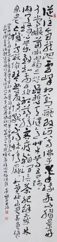 何开鑫先生的狂草作品笔力遒劲,线条流畅,布局巧妙,充满了动感和节奏感。力避狂躁,内含深沉,展现出豪放不羁与细腻内敛的完美结合。他的笔下既有狂草的肆意挥洒,又不失规矩方圆,彰显出深厚的书法功力。
