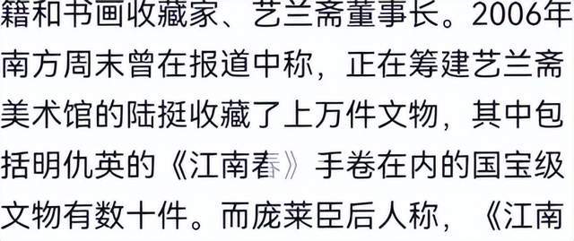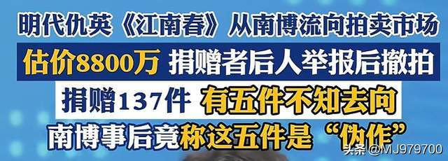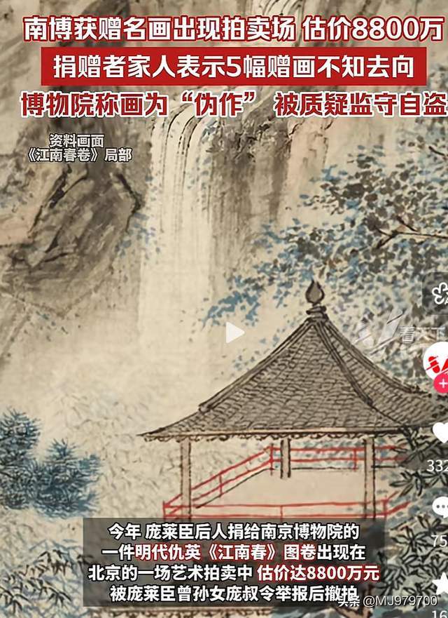 2025年春天,北京某拍卖公司的预展上,一幅明代仇英的《江南春》图卷躺在展台上,估价8800万元 。不过这一场拍卖,却因为一个电话彻底乱了套。电话那头是庞莱臣的曾孙女庞叔令,她向国家文物部门举报:这幅画是我们家1959年捐给南京博物院的,为什么会跑到拍卖会上?