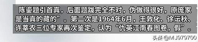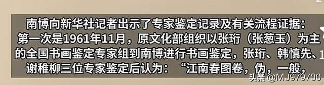 不过,南博向媒体出示的鉴定记录大部分都被马赛克遮挡,只零星露出"江南春图卷,伪"几个字 。这又不是拍动作片,打什么码?专家又凭什么判定为假,到底用的什么标准,具体理由是啥?全都没有定论!