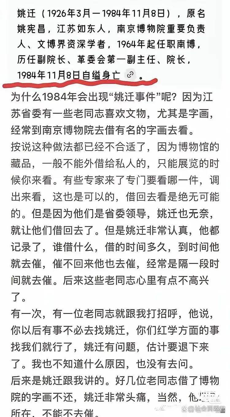 姚迁的自缢,和“剽窃、侵占他人学术成果”有关,在当时的报道中没有提及文物管理工作相关。但之前确实有文献记录过姚迁在工作中为了文物归还,和老同志有摩擦。