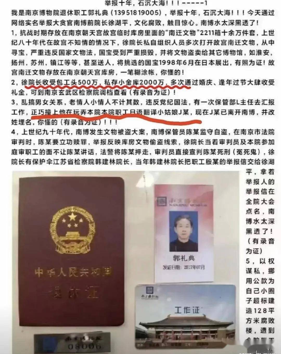 南京博物院典藏部退休职工郭礼典,21日带着42人联名的举报原件,实名举报南京博物院原院长徐湖平。