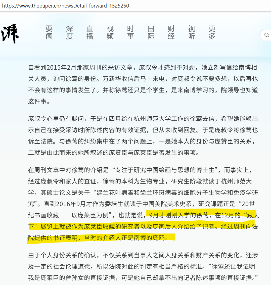 艺兰斋对媒体说过谎话。大家可以看上一篇我截屏的《现代快报》2010年8月30日的报道,研究近代书画大师及藏家的人,怎么可能不知道庞元济只有独子,没有女儿,又如何敢公开称作品归到庞元济莫须有的“苏州的女儿”之后才被艺兰斋收藏?