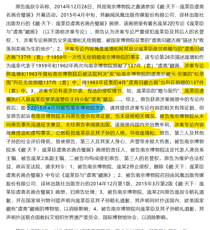 P个S,诸位看官,南博于2014年12月为纪念庞莱臣诞辰150周年而策展,策展人庞鸥却写文章指“庞莱臣的子孙败落到卖画为生”。随后庞莱臣曾孙女庞叔令与南博及庞鸥打名誉权官司。庞鸥在法庭上出示了上述2010年8月底《现代快报》的新闻报道说,此画归于庞莱臣在苏州的女儿,在上世纪90年代被艺兰斋所收藏。一位为纪念庞莱臣诞辰150周年策展的人,一位自称“其是南京博物院副研究馆员,也是《藏·天下--庞莱臣虚斋名画合璧展》的项目负责人之一,南京博物院拨项目经费130万元,展览从创意、策划、设计,到最后的展陈等一系列工作基本由其负责”的人,竟然不知道庞莱臣只有独子没有女儿。这是专业的研究水准吗?