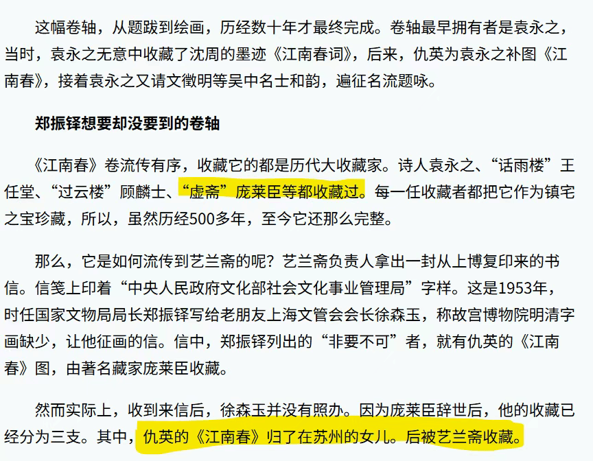 基于论文写作时间,我认为至少江苏收藏界应该是知道艺兰斋早就收藏了仇英的《江南春》图卷的。