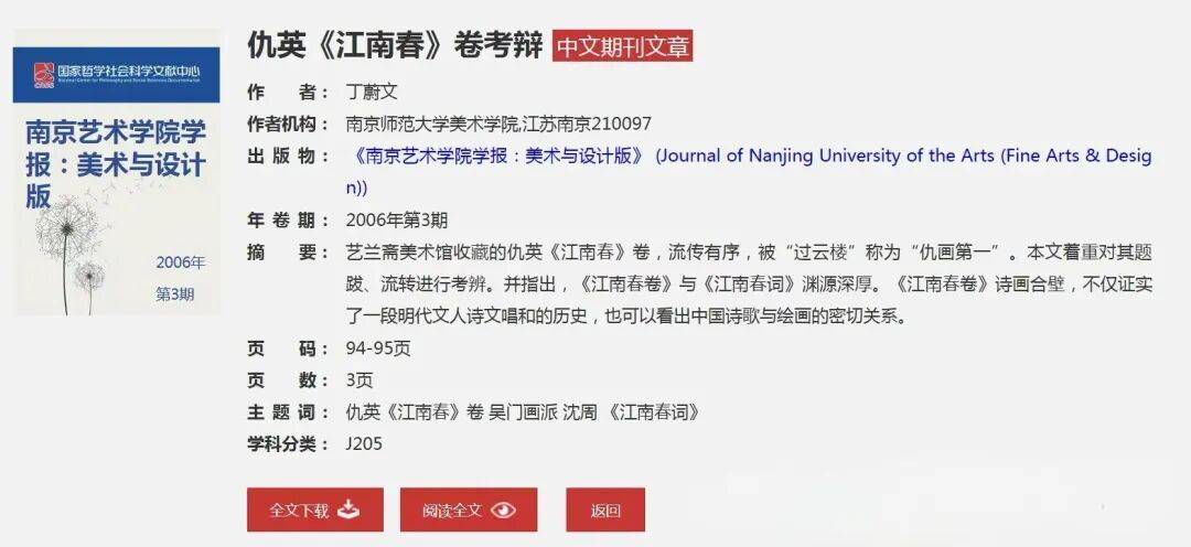 图3 发表于期刊的《南京艺术学院学报》文章《仇英<江南春>考辨》电子页面