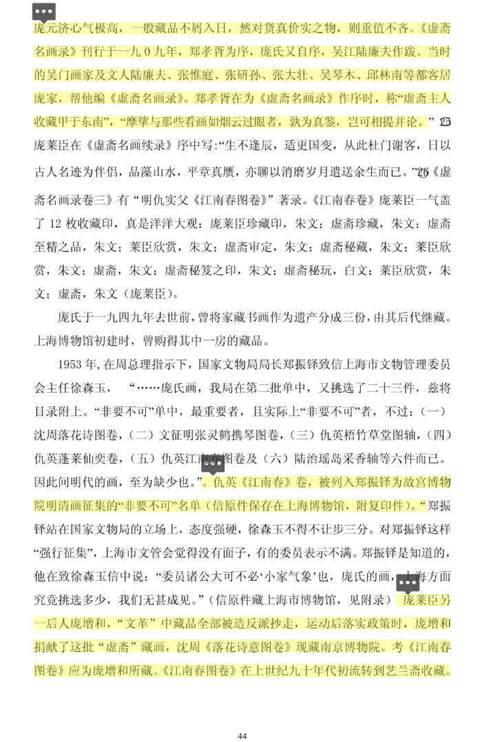 D、在第44页,丁蔚文给出了三个肯定信息。第一个信息、庞莱臣(庞元济)所藏无一不是精品,且不说庞自己就是大家,当时吴门画家、文人客居在庞家,有他们的掌眼,庞收藏的《江南春》图卷会是赝品吗?第二个信息,“考《江南春图卷》应为庞增和所藏。”肯定《江南春》真迹由庞元济传给了孙子庞增和。第三个信息,“《江南春图卷》在上世纪九十年初流转到艺兰斋收藏。”