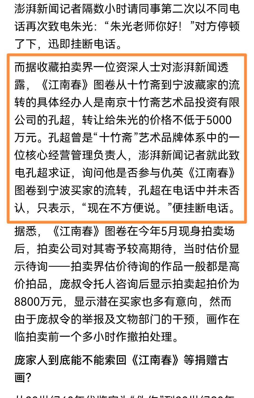 这笔交易的经办人是十竹斋艺术品投资有限公司的孔超。当记者向孔超求证是否参与《江南春》流转时,他并未否认,只表示“现在不方便说”便挂断电话。