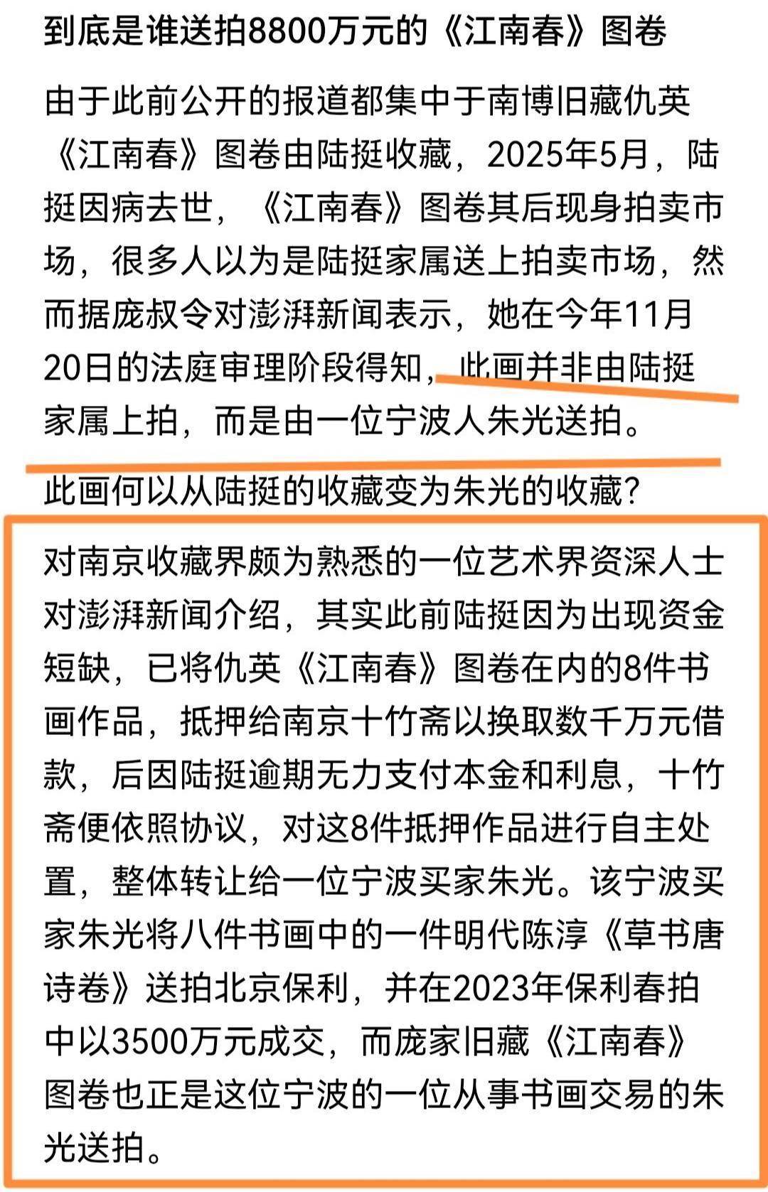 为缓解资金压力,陆挺将包括《江南春》在内的八幅书画抵押给南京十竹斋,换取数千万元借款。十竹斋是国有文化投资公司,股东包括南京文物公司。由于陆挺逾期无法偿还债务,十竹斋按协议处置这些抵押品,整体转让给宁波买家朱光,交易价格不低于5000万元。