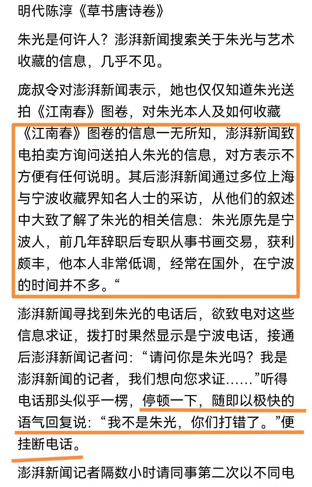 朱光成为这场风波的关键人物。他辞去工作专职从事书画交易,常年在国外活动,在宁波时间不多。拿到八幅书画后,他先将明代陈淳《草书唐诗卷》送拍北京保利,2023年以3500万元成交。