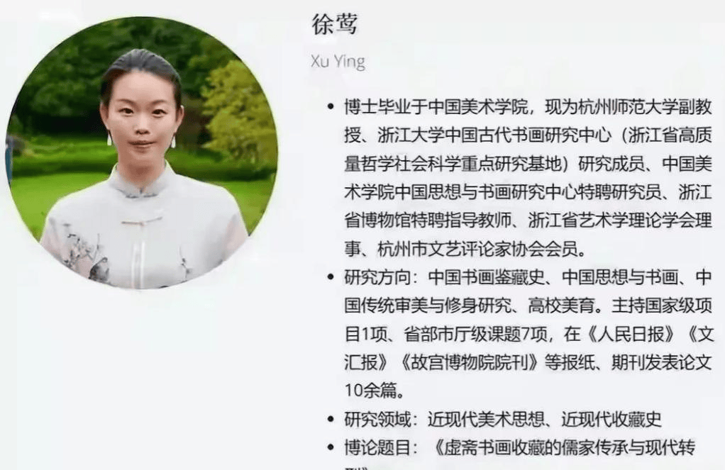 更离谱的还在后面。2017 年,徐莺入职杭州师范大学音乐学院,如今已经晋升为副教授。翻开她的履历,“中国美院博士、古代书画中心研究员” 的头衔赫然在列,不知道的还以为她是深耕书画领域几十年的专家。
