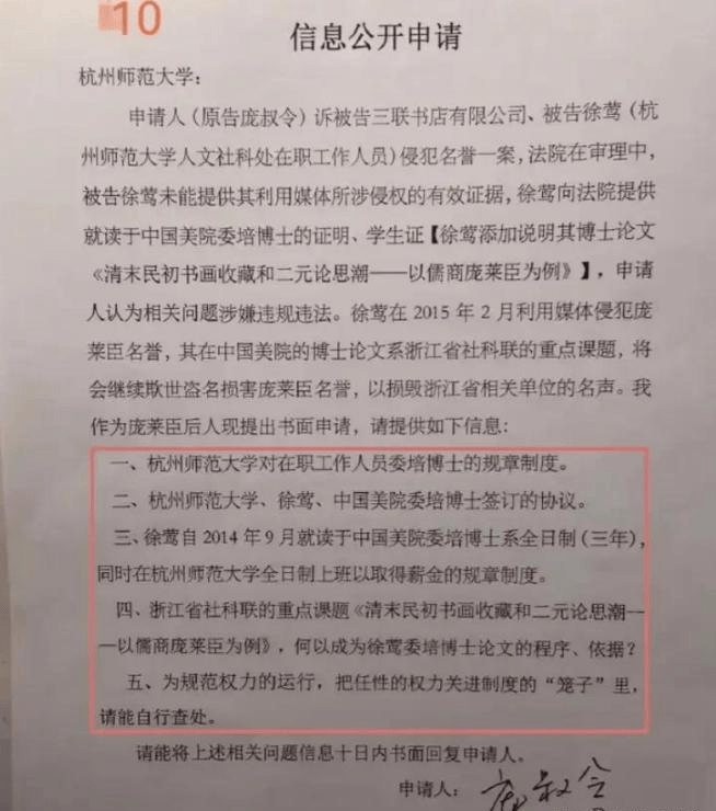 庞家后人庞叔令显然也看穿了这其中的猫腻,直接向杭州师大递交申请,要求公开徐莺的学术兼职、薪资发放等关键信息,直指她的学术履历存在重大疑点。