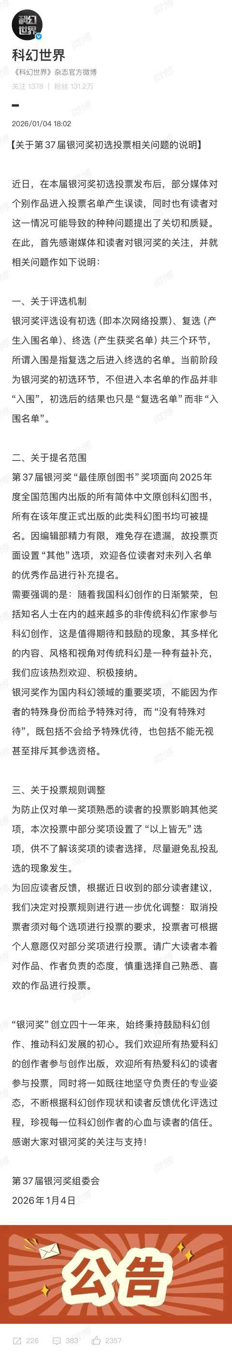 1月4日,第37届银河奖组委会发文表示部分媒体对个别作品进入投票名单产生误读,并说明本届银河奖评选设有初选(即本次网络投票)、复选(产生入围名单)、终选(产生获奖名单)三个环节。所谓“入围”是指复选之后进入终选的名单。当前阶段为银河奖的初选环节,不但进入本名单的作品并非“入围”,初选后的结果也只是“复选名单”而非“入围名单”。