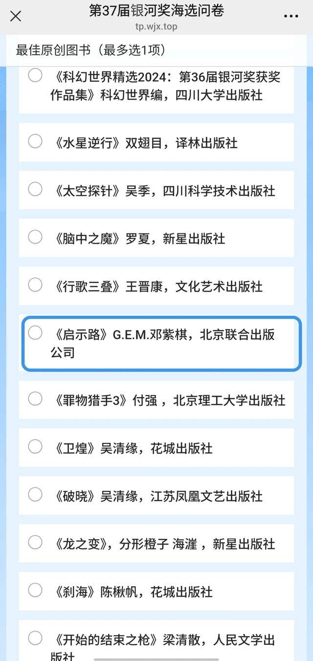 组委会还表示,第37届银河奖“最佳原创图书”奖项面向2025年度全国范围内出版的所有简体中文原创科幻图书,所有在该年度正式出版的此类科幻图书均可被提名。因编辑部精力有限,难免存在遗漏,还在投票页面设置“其他”选项,欢迎读者进行补充提名。