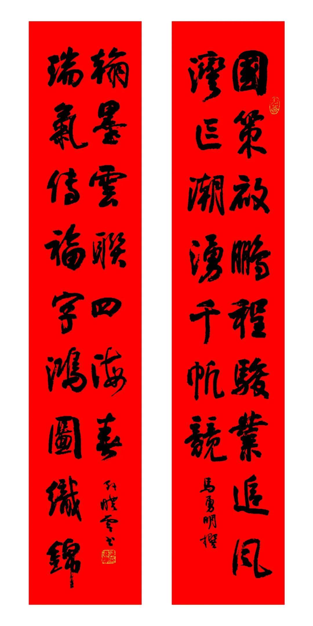 马勇明先生以春联这一最具年俗气息的艺术形式,既传承了楹联文化的艺术传统,又赋予其新时代的思想内涵。上联聚焦“国之大者”,歌颂国策引领下的发展成就;下联着眼文化传承与民生幸福,传递四海同春的美好祝福,二者相辅相成,既彰显了文化自信,又凝聚了民族情感。让人们在品味笔墨书香的同时,感受到时代发展的强劲脉搏与中华文化的深厚底蕴,激励着国人以骏业追风的干劲,赴鸿图织锦的蓝图,在新的一年里续写家国繁荣、四海同春的时代华章。