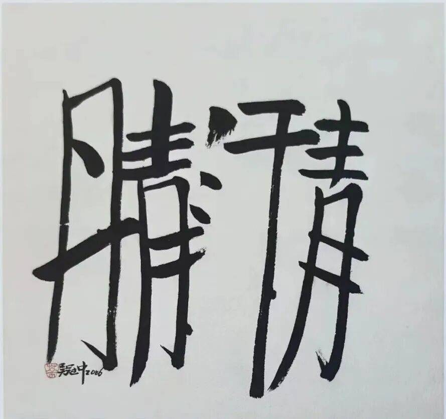 展览之所以取名《丹青汗青》,是源自于吴冠中的一幅书法作品,当然吴冠中的书法也有别于现代的书家字,字体为楷书横写,每个字都写得很长,组合在一起几乎是一个方形的块面,在第一丹字的下面,吴冠中有一个标志性的签名。